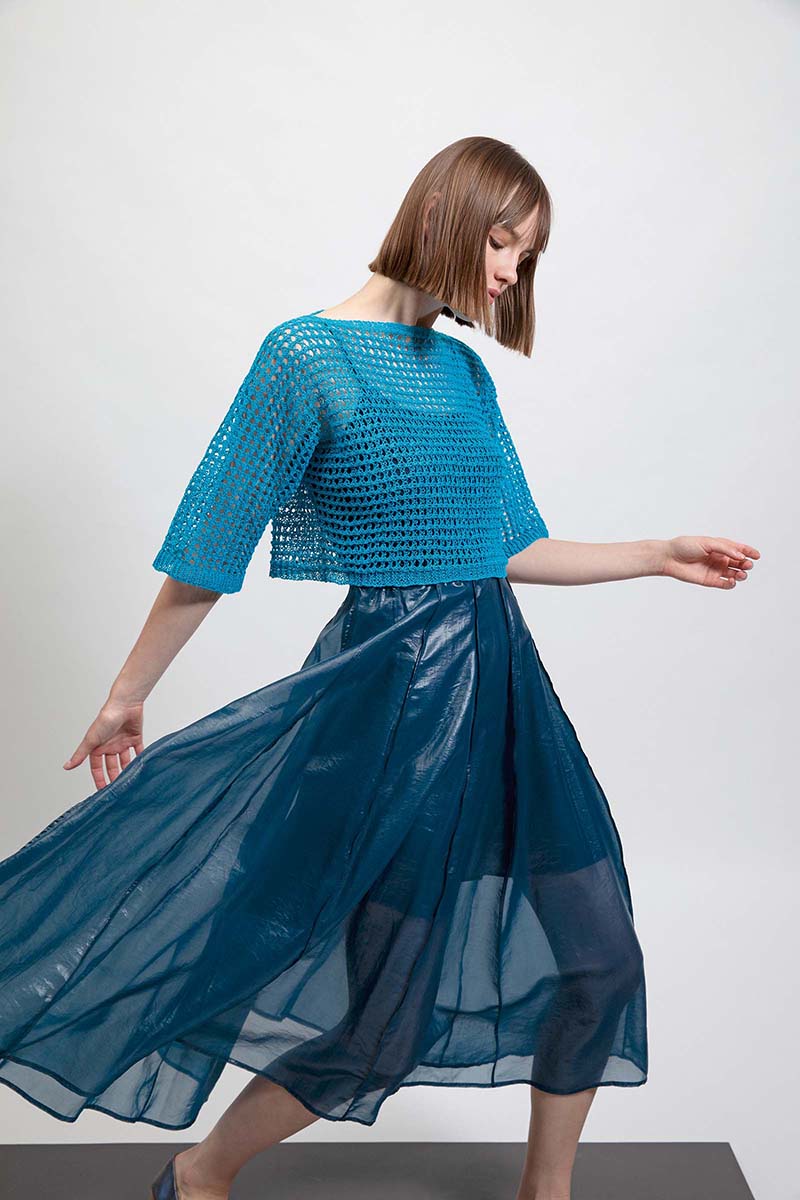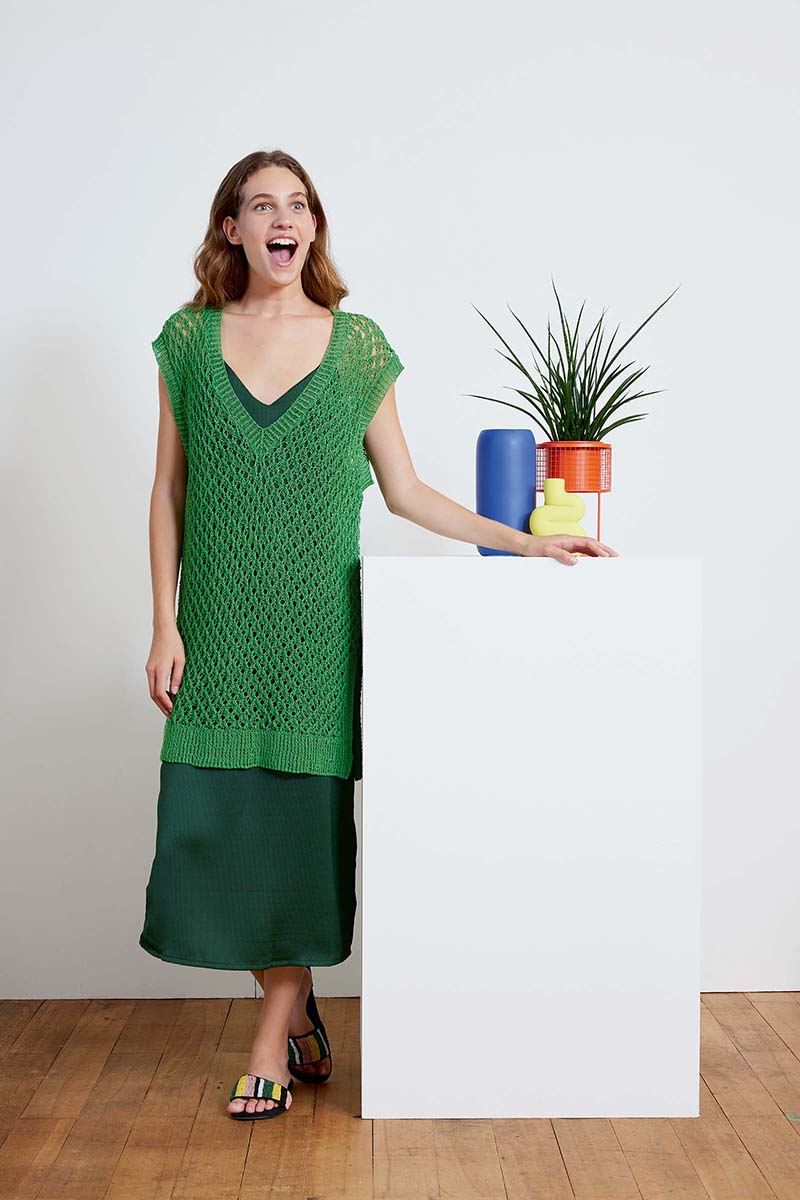 Crealino nabízí výjimečnou definici ok, která dává vyniknout jak hladkému lícovému úpletu, tak vzdušným dírkovým vzorům. Díky své prodyšnosti a chladivému efektu je ideální volbou pro lehké topy, tílka a tuniky. Můžete ji pletit na tenších jehlicích pro kompaktnější vzhled, nebo zvolit silnější jehlice a vytvořit tak éterický, splývavý model, který bude dokonale dýchat i v tom největším horku.