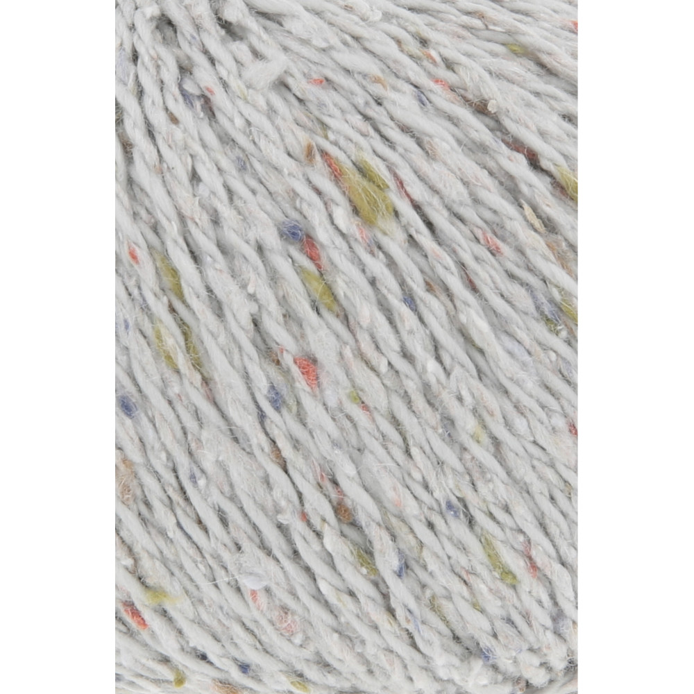 Bavlna s tweedovým efektem v klasickém vícenitkovém skaní. Příze je méně pružná než vlna, což zajišťuje dobrou tvarovou stálost letních modelů. Barevné nopky vytvářejí jemně strukturovaný povrch.