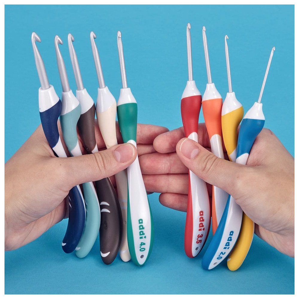 Revoluční háčky Addi Swing Maxi mají ergonomickou rukojeť a protiskluzový povrch. Jsou pohodlné a perfektně padnou do ruky, při pocení rukou háček neklouže. Skvěle se s nimi pracuje a díky anatomickému tvaru jsou ideální pro delší nebo časté háčkování, při kterém bolí zápěstí a způsobuje křeče a záněty karpálních tunelů. Každá barva odpovídá jiné velikosti, rychle tak najdete háček, který zrovna potřebujete. Ergonomické háčky byly pro Vás opět vylepšeny. Ergonomická rukojeť je navržena tak, aby Vaše ruce i při dlouhém háčkování netrpěly. Aby háček padl skvěle do ruky a aby Vás nechytaly křeče a nebolely klouby prstů a zápěstí. Výrobce Addi reagoval na přání háčkařek a rozšířil sortiment o háčky Addi Swing Maxi s prodlouženou kovovou částí háčku.