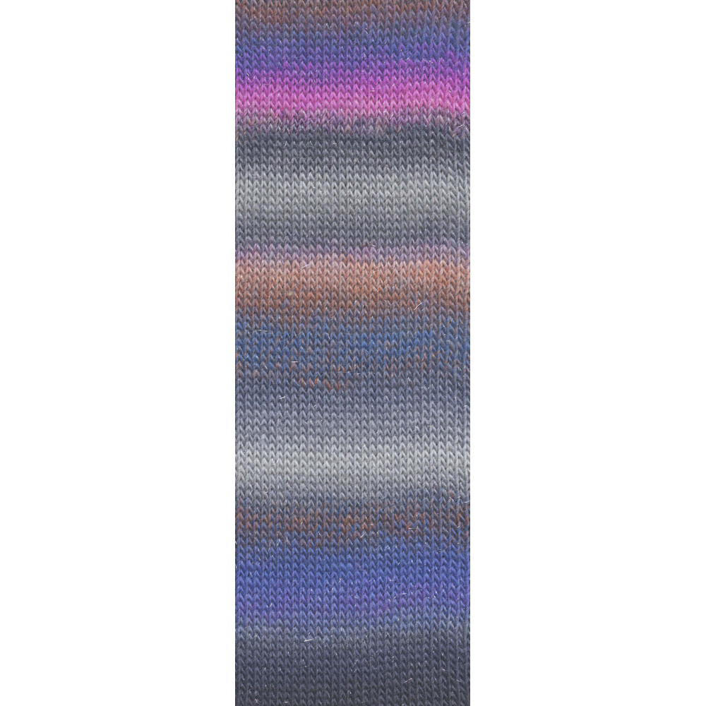 Mille Colori Socks & Lace Luxe: Odolná směs vlny a polyamidu s přídavkem metalického vlákna. Příze je předená jako jemná jednonitka s vysokým návinem, vhodná pro pletení luxusních ponožek i krajkových šátků, kterým dodává decentní odlesk.