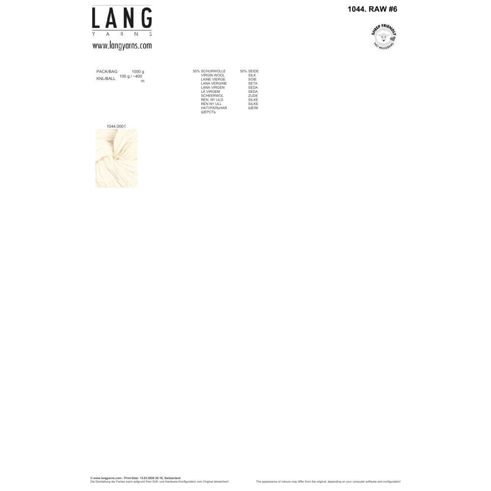 Více se dočtete v popisuRAW #6 | 1044.0001 – Prvotřídní příze pro ruční barvení VYSOKOKVALITNÍ PŘÍZE PRO PROFESIONÁLNÍ BARVÍŘE. Značka LANGYARNS disponuje desítkami let zkušeností v selekci surovin a technologiích předení. S kolekcí RAW by LANGYARNS dáváme poprvé k dispozici naši kompletní kompetenci a servis profesionálním barvířům v podobě výběru těch nejkvalitnějších základových přízí. RAW #6 je exkluzivní základ pro vaši tvorbu ve 100g přadenech. Příze je vyrobena zcela bez uzlů (technologií splicing), což zaručuje dokonalý výsledek bez kazů. TECHNICKÉ PARAMETRY: • Složení: 50% střižní vlna (Merino extrafine, 19.5 mikronu) – mulesing-free / 50% hedvábí (Tussah Silk). • Úprava: Superwash. • Návin: cca 400 m / 100 g. • Formát: 100g přadena určená k barvení. • Kvalita: Bezuzlová produkce (spojováno splétáním). PRODEJNÍ INFORMACE: • Cílová skupina: Nabídka určena pro komerční barvíře v EU a Švýcarsku. • Prodejní jednotka: Prodáváme pouze celá balení. • Balení obsahuje: 10 přaden x 100 g = 1 kg (Art. 1044.0001).