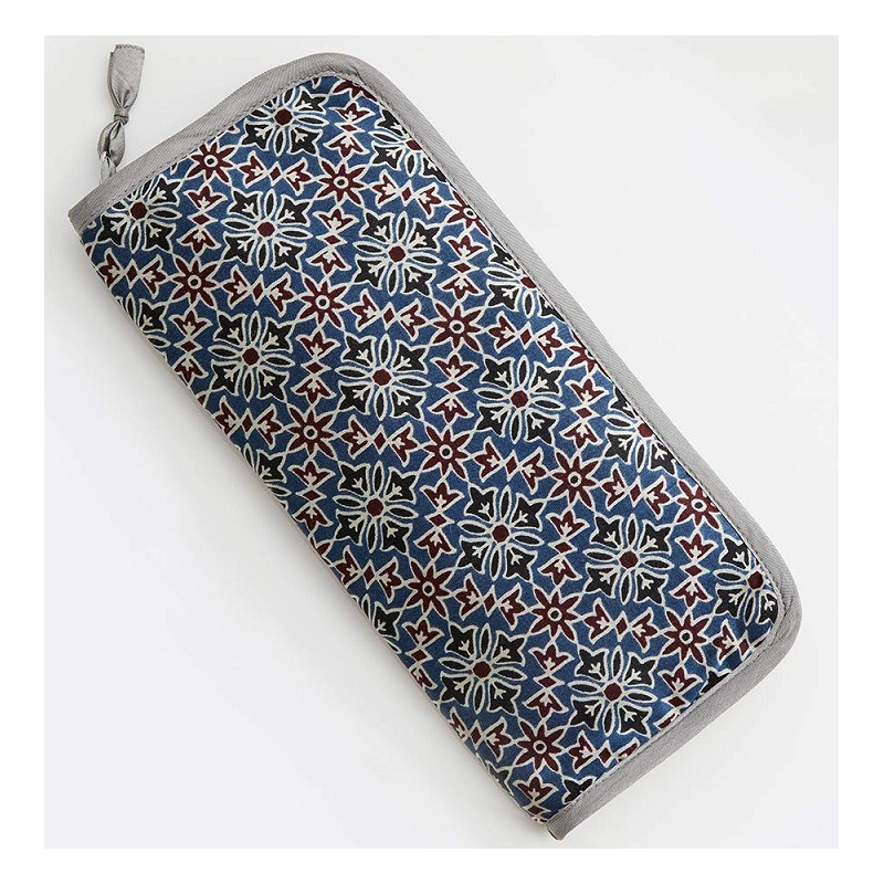 Polstrované pouzdro na zip na ukládání a organizování jehlic, vyrobené ze saténového modalu s použitím tradiční tkaniny Ajrak