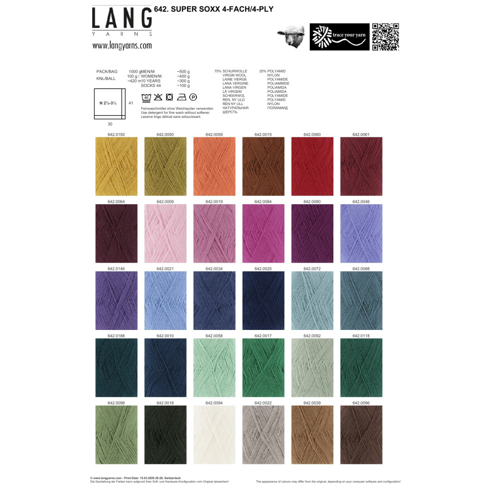 Super Soxx 4-fach: Klasická čtyřnitková ponožková příze s vysokým zákrutem. Směs vlny a polyamidu zajišťuje vysokou odolnost proti oděru a tvarovou stálost. Úprava superwash umožňuje snadnou údržbu a praní v pračce bez rizika plstnatění.